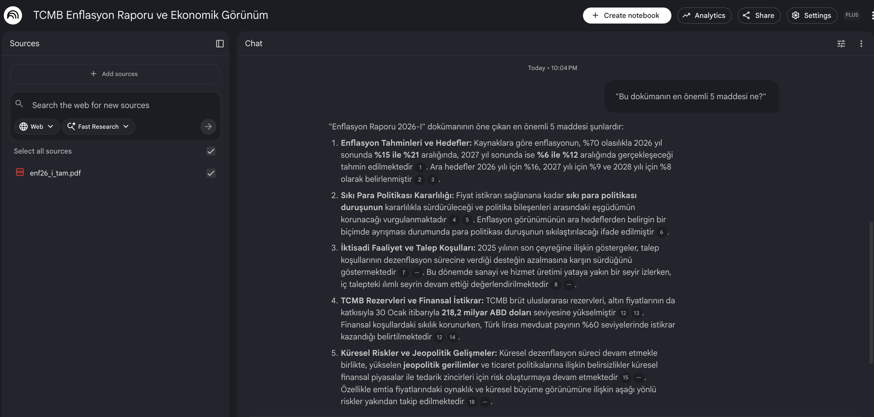 Denedim, sonuç: 56 sayfalık bir raporu 5 maddede özetledi. %80 doğruluk — ama %80 bile manuel okumadan çok daha hızlı.